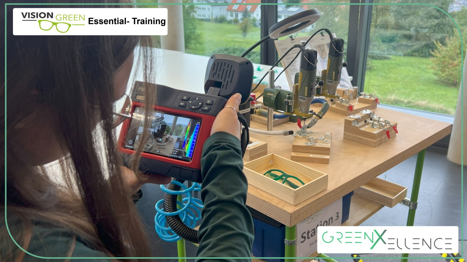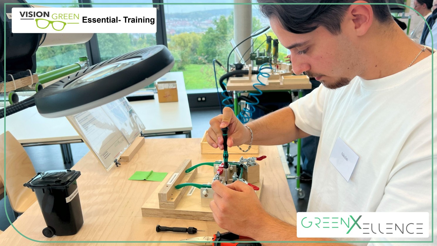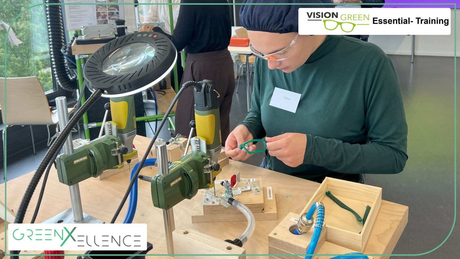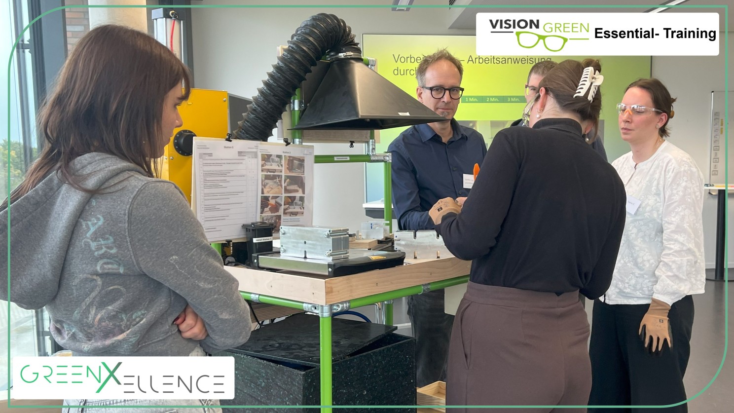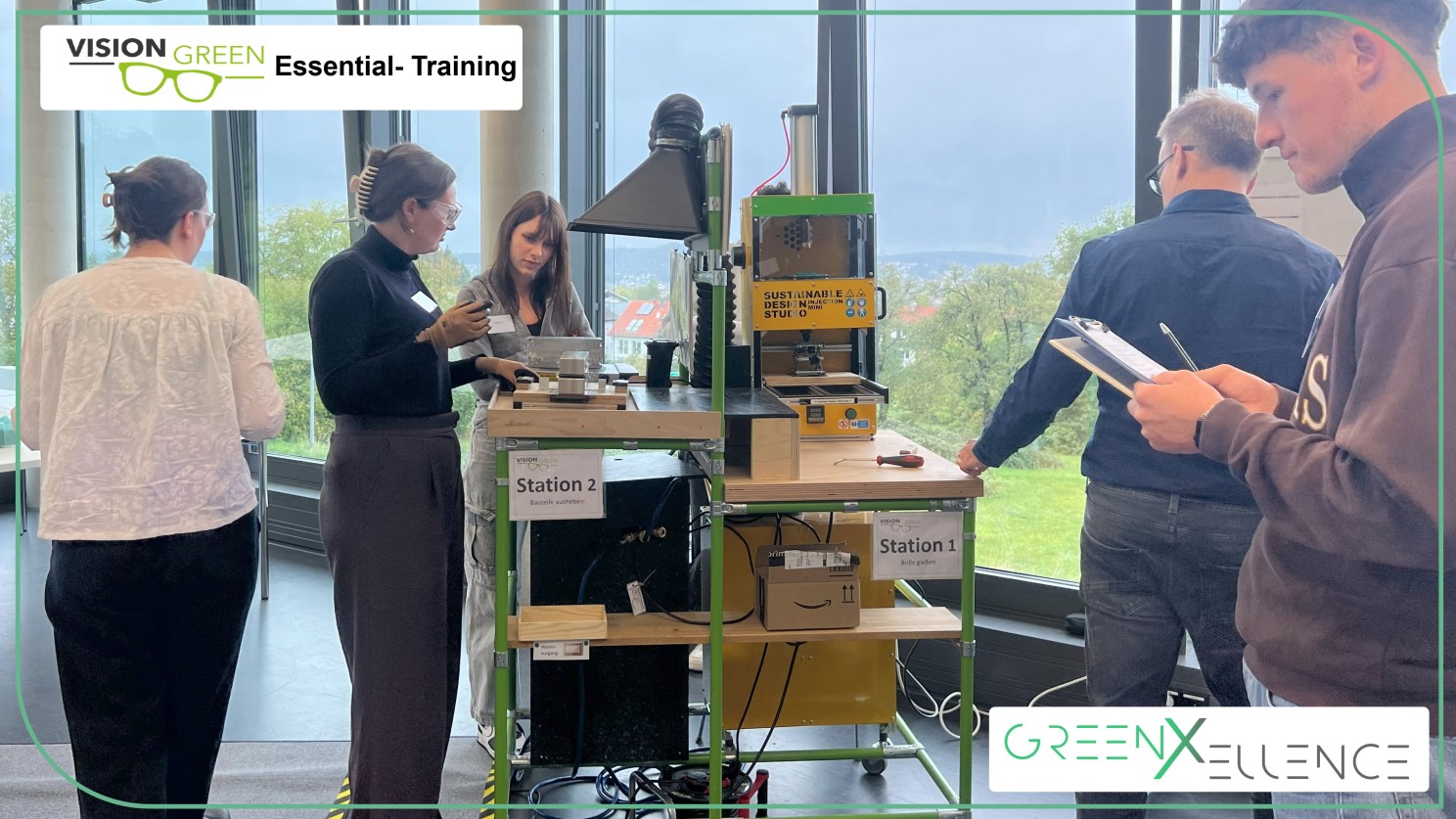 Vor wenigen Tagen verwandelte sich ein Seminarraum der Hochschule Pforzheim in eine Werkstatt voller Energie: Bohrer surrten, Pressluftkompressoren brummten und es lag der Geruch geschäftigen Arbeitens in der Luft – fast wie in einer echten Fertigungshalle. Inmitten dieses Szenarios wagten acht Master- und Bachelorstudierende gemeinsam mit Prof. Dr. Frank Bertagnolli ein spannendes Experiment: das neu entwickelte Vision Green Essential Training von greenXellence. Ihre Mission: aus recyceltem Kunststoff eine funktionierende grüne Brille herzustellen – Sinnbild für den geschärften Blick auf eine Produktion, die kostengünstiger, energieeffizienter und ressourcenschonender ist.